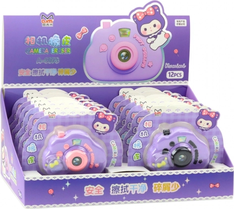 Radirka v obliki fotoaparata, vijolična. Praktičen in zabaven šolski dodatek z odprtljivim pokrovom.