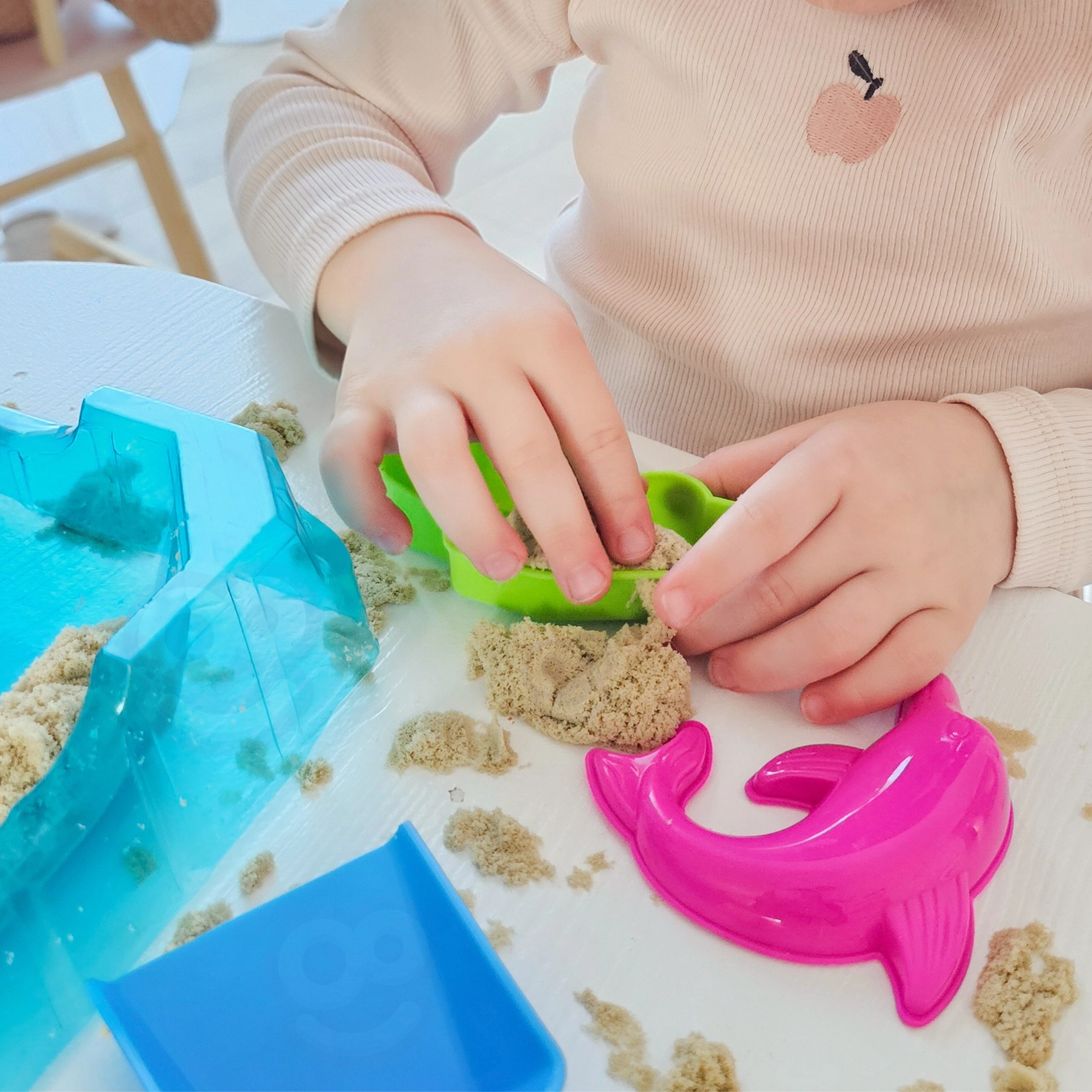 Del kompleta je kompakten pladenj, ki služi kot prenosni peskovnik in ohranja red med igro. V paketu najdete tudi lopatico, grabljice, valjček ter komplet barvnih modelčkov (npr. delfin, avto, ladja, lokomotiva), zato je ustvarjanje preprosto in navdihujoče.