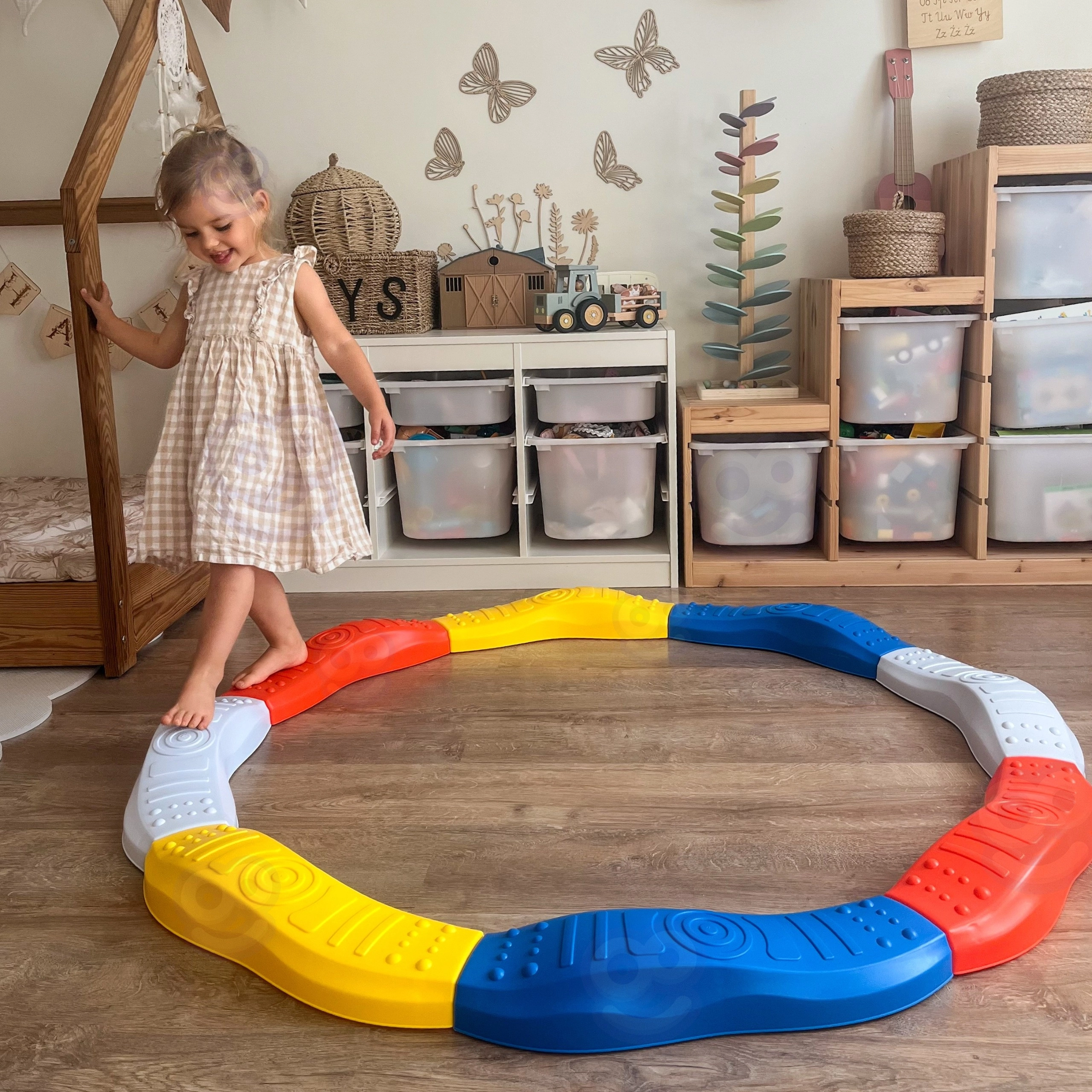Ustvarite krog s premerom približno 130 cm, vijugasto »kačasto« pot ali manjše kroge. Steza je primerna za otroško sobo, igralnico in tudi vrt – potrebna je le ravna podlaga. Odlično za grobo motoriko, propriocepcijo in zabaven trening ravnotežja bosi ali v nogavicah.