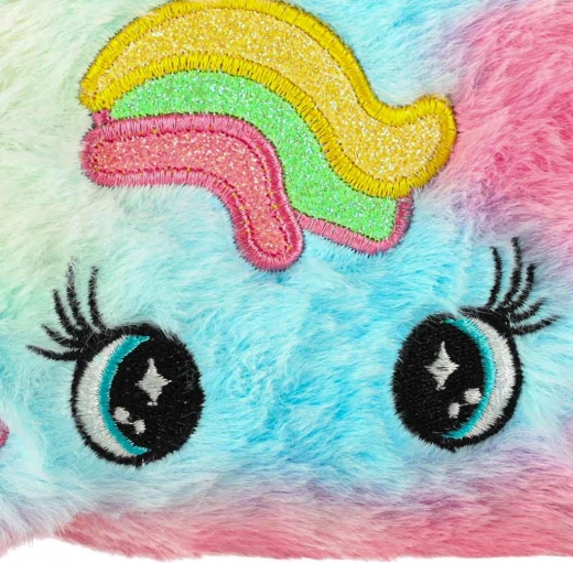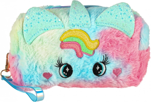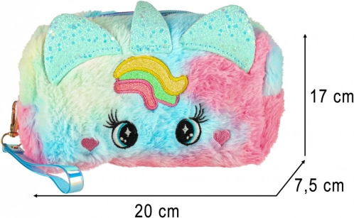 Kozmetična torbica ima prikupen dizajn z mavričnim vzorcem in edinstvenimi ušeski, kar jo naredi odličen estetski dodatek za vsako malo princesko.
