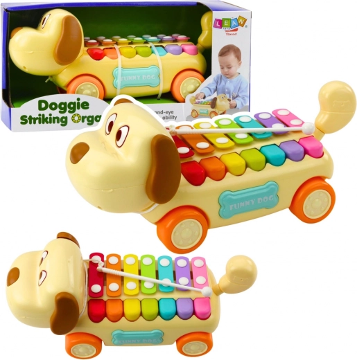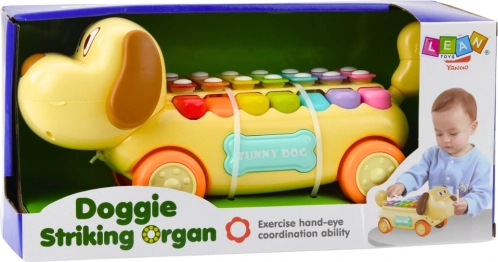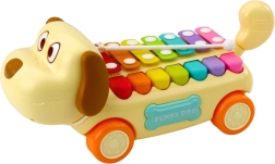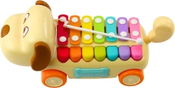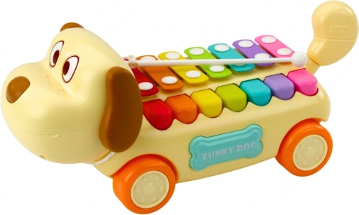 Vozni kuža je opremljen s celotno paleto barvitih činel, ki jih lahko zaigrate s priloženo paličico. Zahvaljujoč pritrditvi paličice na igračo z vrvico je preprečena njena izguba tudi med intenzivno igro. Kuža je izdelan iz trpežnih in varnih materialov, njegova zasnova podpira razvoj koordinacije oko-roka, fine motorike in glasbene občutljivosti. Idealno kot izobraževalna igrača za otroke od 18 mesecev.
