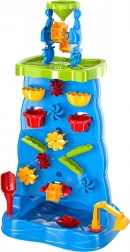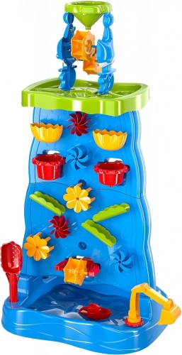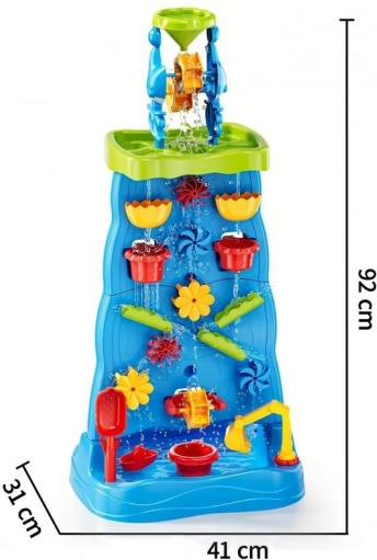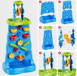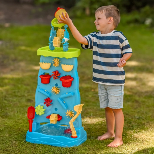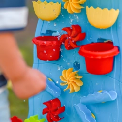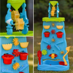 Ta pisana vodna stena z visokim stolpom in kaskadami otrokom ponuja neskončno mero zabave z vodo in peskom. Zahvaljujoč modularni zasnovi lahko spreminjajo razporeditev lijakov, žlebov in koles ter opazujejo vzrok in posledico pri pretakanju vode. Dvostranska izvedba omogoča sočasno igro z obeh strani – idealno za sorojence in prijatelje.
