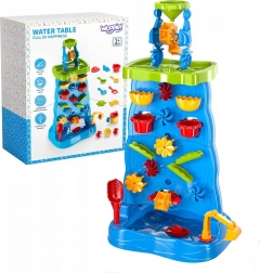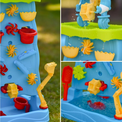 Široka osnova in stena, dostopna z obeh strani, omogočata skupno igro. Otroci lahko hkrati nalivajo vodo, opazujejo kaskade in vrteča se kolesa – idealno za deljenje in sodelovanje.