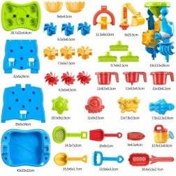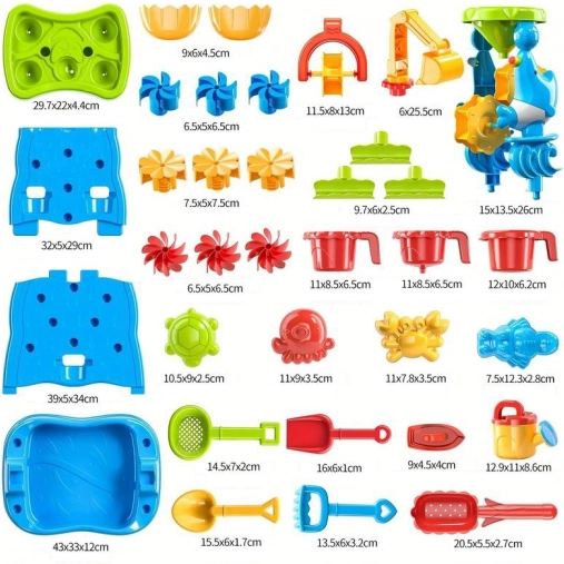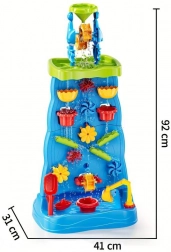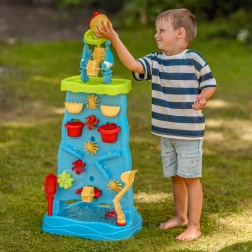 Montaža je hitra in brez orodja. Priložena je bogata oprema: lopatke, grabljice, sita, zalivalka, vedro, modelčki in lončki za vodo. Igrača podpira senzorično zaznavanje, logično razmišljanje in reševanje težav – vse v obliki zabavnega eksperimentiranja.