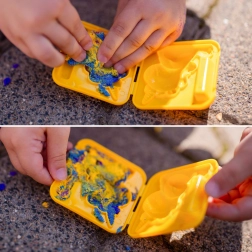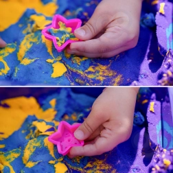 Otroci lahko stiskajo, režejo in oblikujejo pesek v zvezdice in druge motive. Odlično za čutno igro in razvoj fine motorike.