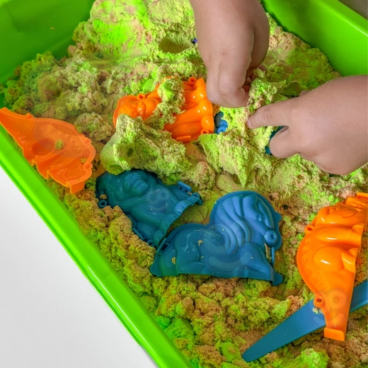 Kinetični pesek je prijetno mehak, drži obliko, se ne lepi na roke in nudi pomirjujočo čutno izkušnjo pri gnetenju in stiskanju.