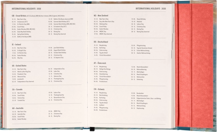 Dnevnik je v angleškem jeziku in vsebuje tudi pregled mednarodnih praznikov, kar olajša načrtovanje v globalnem merilu. Zaradi praktičnega magnetnega zapiranja vam ni treba skrbeti za izgubo pomembnih zapiskov ali skritje pomembnih informacij.