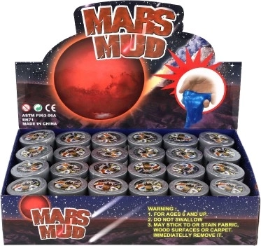 Kovinski sluz Mars Mud razveseli otroke in odrasle. Ima prijetno, počasi tekočo konsistenco, ki se odlično oblikuje, razteza in stiska. Prozoren lonček poudari izvirne barvne vrtince in kovinski lesk.