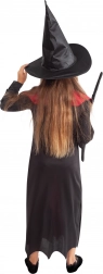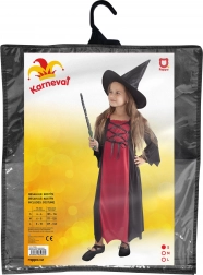 Kostum vključuje črno-rdečo obleko z daljšim krojem in podrobnim zavezovanjem, ki ustvarja pristni čarovniški slog. Odlično za noč čarovnic ali karnevalska praznovanja.