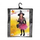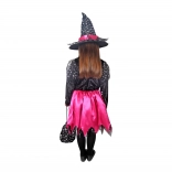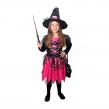 Čarobni pustni kostum za male čarovnice! Črno-rožnat kostum je idealen za deklice, stare 6–8 let, višine 117–128 cm. Odlikujejo ga rožnati trakovi in srebrne zvezdice.