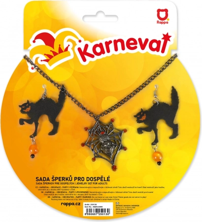 Izboljšajte svoj strašljivi kostum s tem skrivnostnim kompletom nakita, idealnim za noč čarovnic ali čarovniške zabave. Vsebuje eleganten ogrlico s pajkom in uhane z mističnimi mačkami.