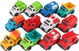 V pakiranju najdete mešanico priljubljenih tipov, kot so kipar (prekucnik), mešalec betona, cisterna, gasilsko vozilo, rešilno vozilo in druga uporabna vozila. Raznolike oblike in funkcionalni elementi (npr. prekucna keson škatla ali vrtljiv boben mešalca) razvijajo domišljijo in spodbujajo tematsko igro.