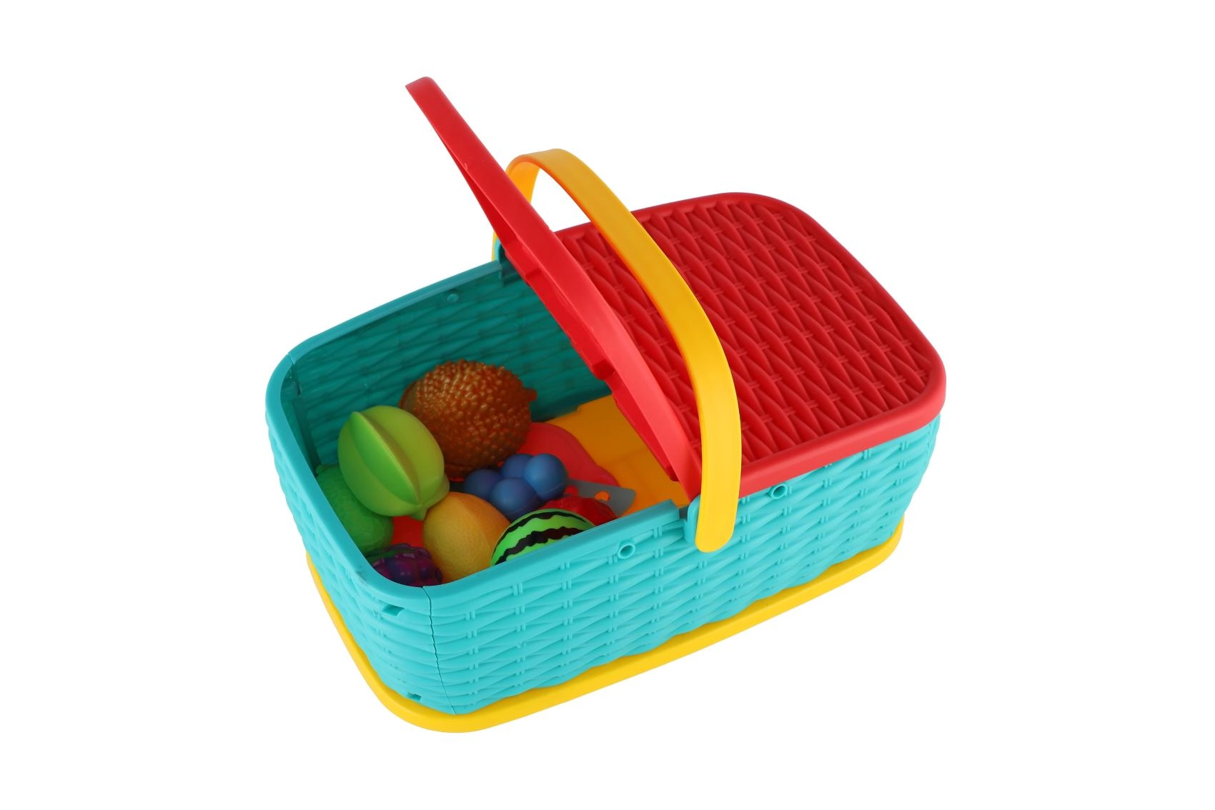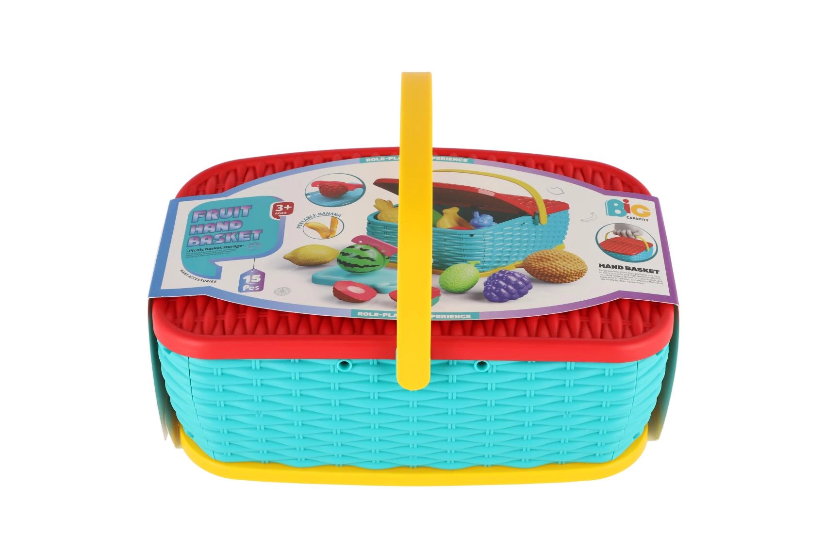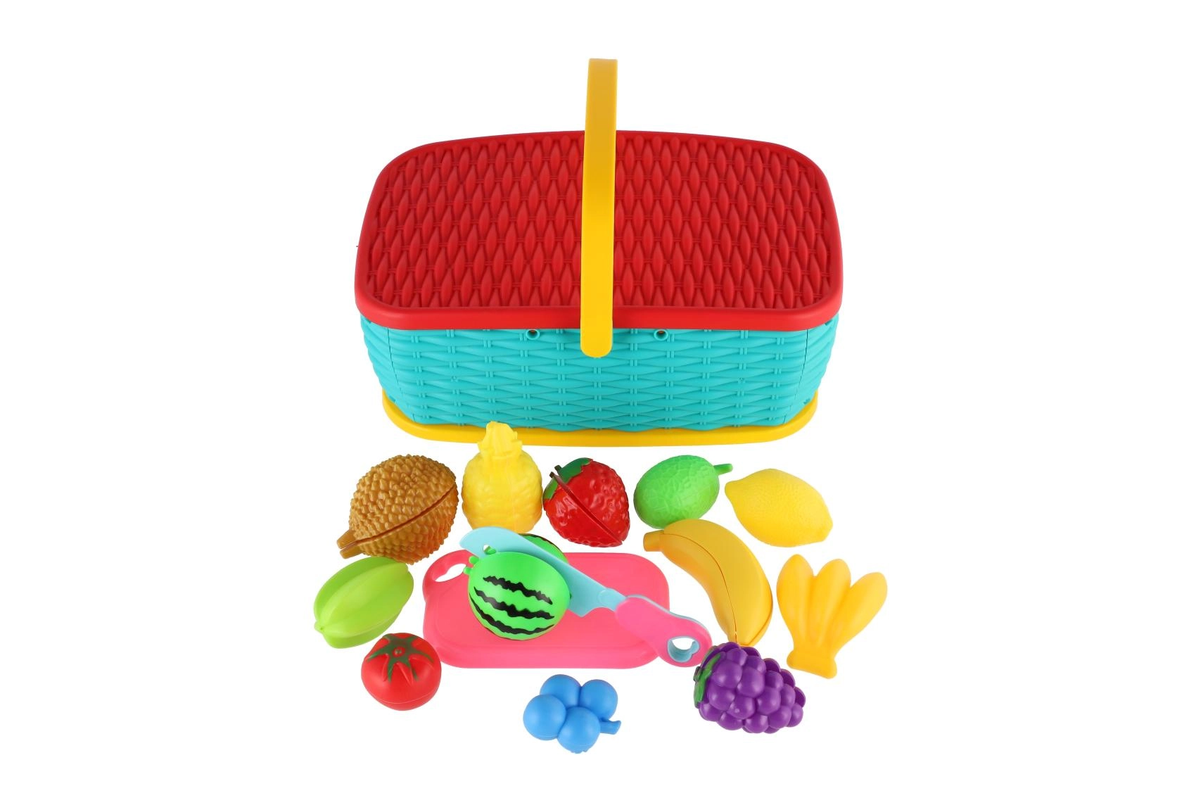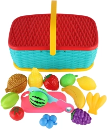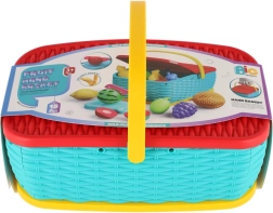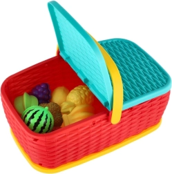 Hura na piknik! Ta barvita plastična košara skriva komplet 15 delov s sadjem in zelenjavo, ki jih lahko otroci “režejo” z varnim plastičnim nožem. Deli so povezani z ježkom, zato jih je mogoče večkrat razstaviti in ponovno sestaviti. Odlična igrača za razvoj fine motorike, domišljije in igre kuharja.
