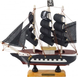 Ta pomanjšan model piratske ladje je izdelan iz lesa in ročno dodelan z poudarkom na simetriji, proporcih in realističnih detajlih, kot so ograjno in jamborno vrvovje, okrašen krmni del ter lobanja na jamboru. Postavljen je na stabilno osnovo z opisno ploščico, kar ga naredi idealno dekoracijo za knjižnico, pisarno ali domačo zbirko. Zaradi svoje kompaktne velikosti ga lahko postavite tudi v omejen prostor, kjer vnaša pridih morske avanture in pritegne pozornost s kontrastnimi barvami.