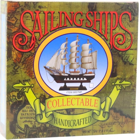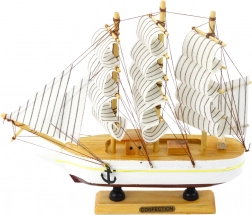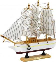 Ta replika je izdelana iz lesa in ročno dodelana, kar zagotavlja njeno pristnost in kakovost. Kombinacija svetlega trupa in črnih črt na belih jadrih ustvarja vizualno izrazit kontrast.