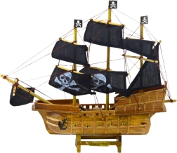 Model trojambornice v piratskem slogu bo navdušil vsakega ljubitelja morskih dogodivščin. Zasnovan po legendarnih korsarskih ladjah iz 17. in 18. stoletja, ta model ponuja naravni lesen trup s stranskimi imitacijami topov ter izrazito linijo krme in premca. Črna platnena jadra z motivi lobanje in prekrižanih kosti ter piratske zastave dajejo ladji neustavljiv, prepoznaven videz, ki spominja na morske razbojnike in legendarno svobodo na odprtem morju.