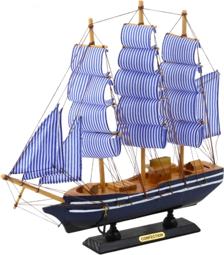 Ta dekorativni model trijamborne jadrnice z modro-belimi črtastimi jadri je izdelan iz visokokakovostnega lesa z tekstilnimi jadri in podrobnim opletom vrvi. Elegantno modro-belo trupje s črnim podstavkom tvori estetsko celoto, ki se poda v stilsko zasnovan interier. Kljub klasičnim prvinam prostoru doda sodoben in zračen videz.