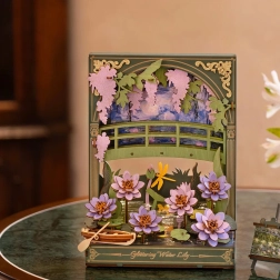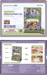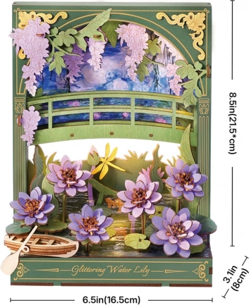 Potopite se v svet umetnosti in sprostitve z našim edinstvenim 3D modelom Bleščečih lokvanjev, navdihnjenim s slovitimi Monetovimi deli. Po sestavi sestavljanka predstavlja očarljivo scenografijo s podrobno izdelanimi cvetovi, čolničkom in lesenim mostom, ki pričarajo vzdušje miru in harmonije. LED osvetlitev dekoraciji doda nezamenljivo čarobno atmosfero, ki prikliče igro svetlobe ob sončnem zahodu.