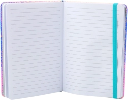 Sredino platnice krasi prozorna školjka, napolnjena s konfeti v obliki cvetov in srčkov, ki se prosto premikajo ob vsakem gibu. Vse skupaj dopolnjuje elastični trak kontrastne barve, ki zvezek ohranja zaprt in ščiti strani pred prepogibanjem ali neželenim odpiranjem.