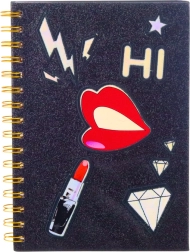 Ta elegantna beležka z izvirnim in modernim videzom združuje temen, bleščeč zaključek s pop-art grafiko, kot so ustnice, diamanti, strele in šminke.
