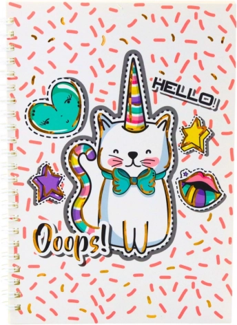 Ta zvezek s pravljičnim motivom mačke samoroga je primeren tako za šolo kot tudi za domače pisanje ali otroški dnevnik. Žična vezava omogoča enostavno odpiranje strani in udobno pisanje na vsaki strani. Njegov kompaktni format A5 je idealen za prenašanje v nahrbtniku, torbi ali predalu.