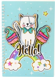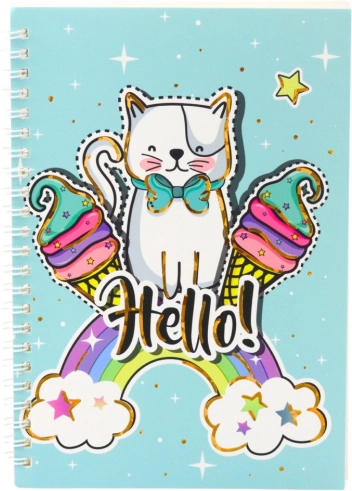 Barvita in vesela beležka z motivom pravljične mačke samoroga je idealna za otroke, ki imajo radi fantazijsko grafiko in pastelne barve. Platnico krasi prijazna mačka s pentljo in samorogovim rogom, ki sedi na pisani mavrici med oblaki, sladoledi in zvezdicami. Beležka je v nežnem turkiznem odtenku, ki doda svežino in pozitivno energijo.