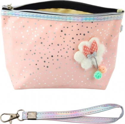 Pudrasto rožnata peresnica kozmetična torbica z mašno in bleščicami