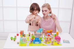 Zahvaljujoč temu kompletu lahko otroci zgradijo tipične mestne zgradbe kot so šola, policijska postaja, gasilska postaja, letališče, bolnišnica, banka, restavracija, trgovina za hišne ljubljenčke in druge. Igrača je izdelana iz naravnih, biološko razgradljivih in hipoalergenih materialov, kar zagotavlja največjo varnost.