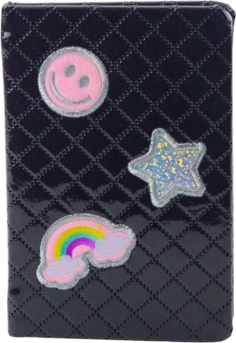 Beležka formata B6 s črnim ovitkom, prekritim z zaščitno folijo, zagotavlja dolgotrajno vzdržljivost in slog. Brokatna površinska obdelava skupaj z našitki v obliki zvezde, nasmeha in mavrice daje sodoben videz.