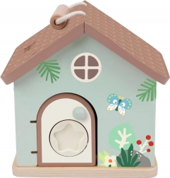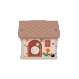 Z obliko in praktično zasnovo ponuja ta lesena hišica vrsto dejavnosti, ki podpirajo otrokov razvoj: