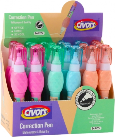 Hitro sušeča se bela tekočina, ki jo korektor vsebuje, odlično prekrije črnilo in kulije. Prostornina 7 ml zagotavlja dolgo življenjsko dobo in učinkovito prekrivanje. Pakiranje vsebuje 24 kosov, barva izbrana naključno.