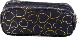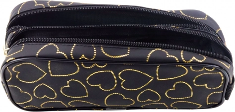 Izdelana je iz trpežnega tekstilnega materiala z nežnim sijajem, izstopa s potiskom zlatih srčkov na intenzivno črnem ozadju. Močne zadrge zagotavljajo varno shranjevanje vsebine. Njena mehka, prožna zasnova omogoča enostavno pospravljanje v nahrbtnik ali torbo brez nepotrebnega zavzemanja prostora.