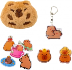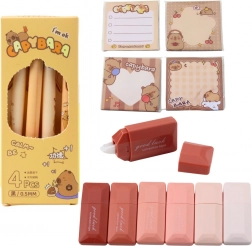 Komplet vsebuje bogat nabor dodatkov z motivom kapibare, med drugim: 4 kemične svinčnike s črnim črnilom, 6 popravljalnih mišk, 4 komplete dekorativnih samolepilnih lističev, plišasto kapibaro z broško, obesek za ključe s kapibaro, 2 sponki s kapibaro in 5 zabavnih nalepk. Izdelek je odlična izbira za darilo za učence, ljubitelje živali ali kogar koli, ki ima rad edinstvene dodatke za učenje.