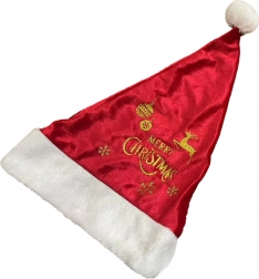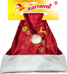 Ta elegantna božična kapa je odličen dodatek za vse božične priložnosti. Njena rdeča osnova je polepšana z dekorativnim zlatim potiskom, ki pritegne pozornost. Bela cofka na vrhu doda kapi tradicionalen videz.