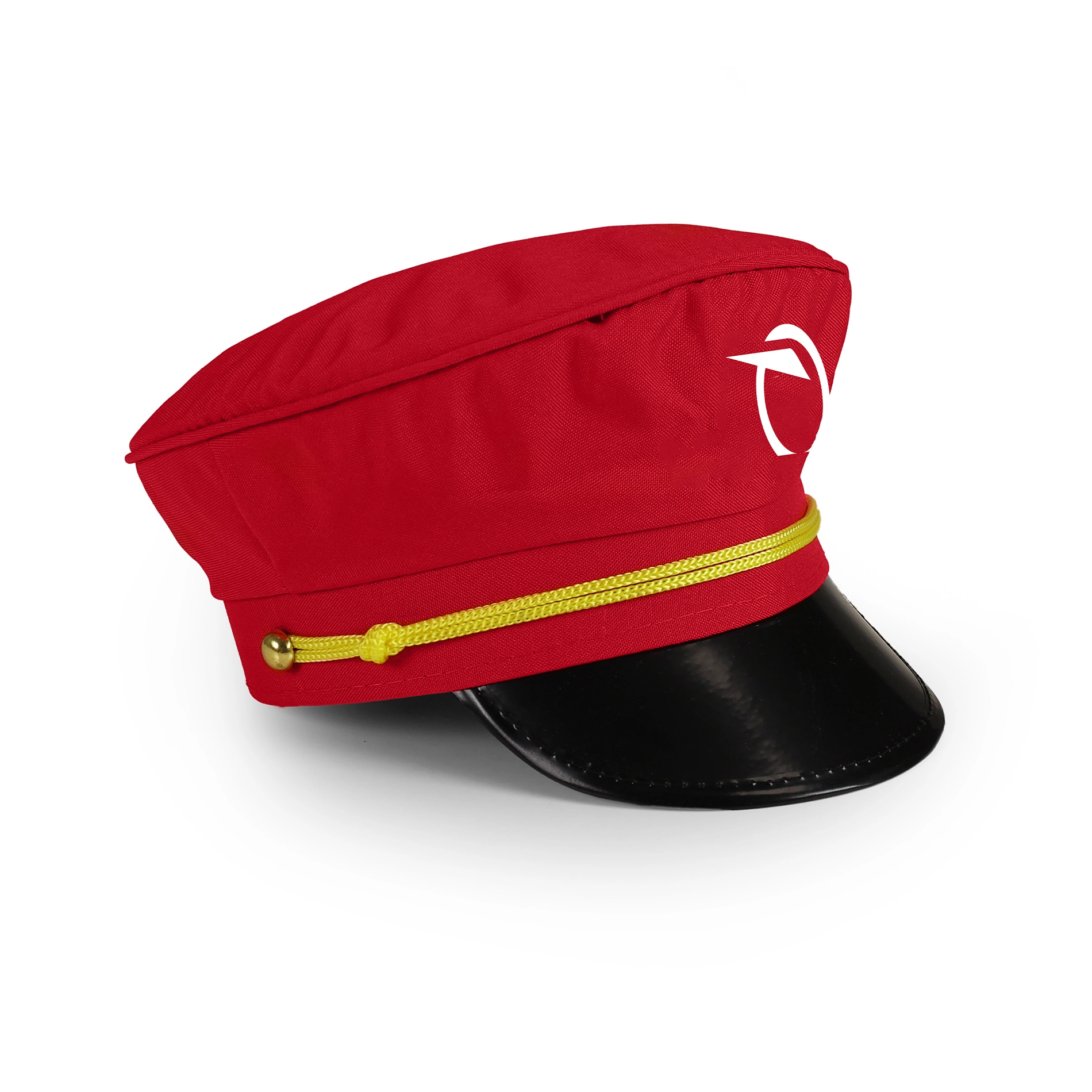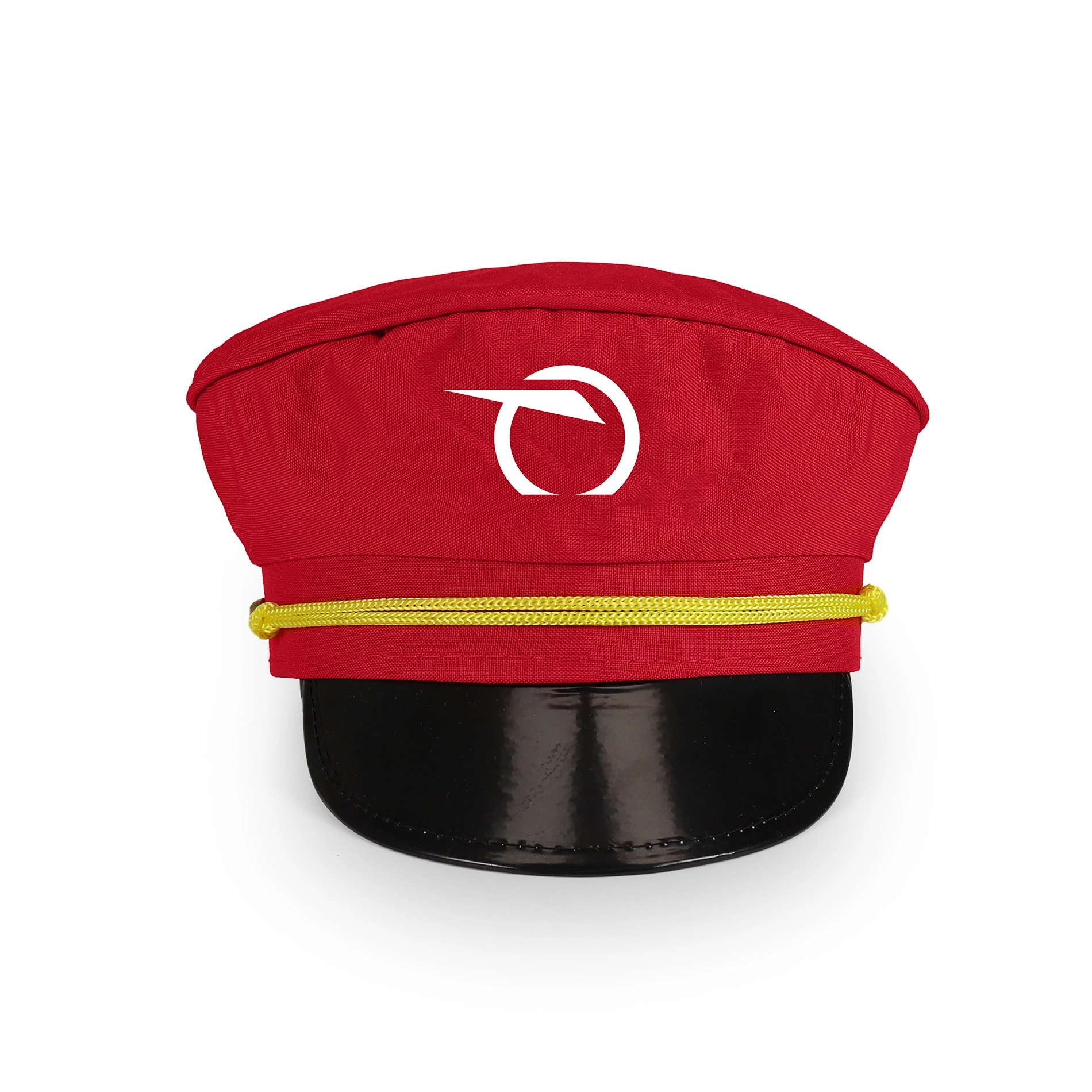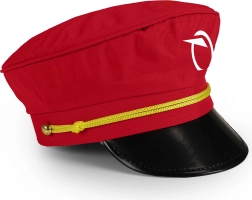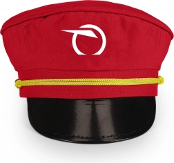 Stilska rdeča kapa z logotipom Železničnej družby Slovensko, črnim sijočim ščitnikom in rumeno vrvico. Idealna za igro odpravnika.