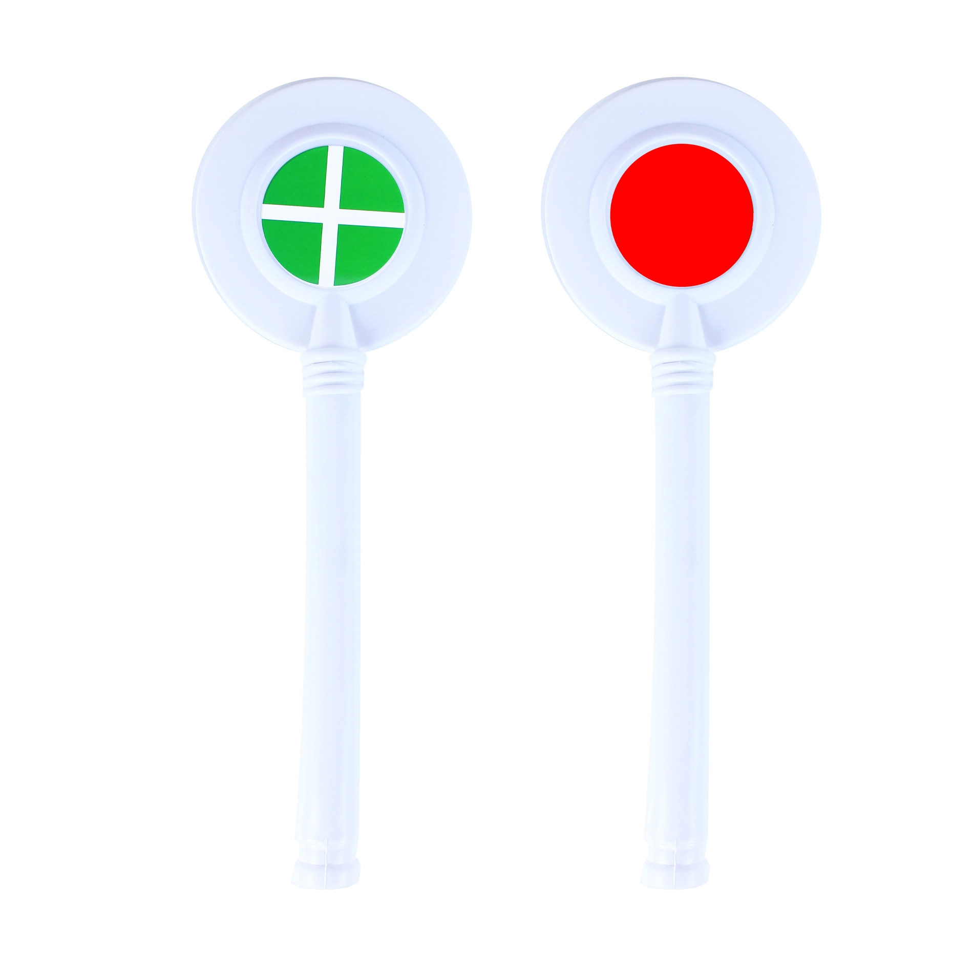 Dva plastična loparčka z dolgimi belimi ročaji, eden z zelenim krogom in drugi z rdečim. Odlično za igro in signalizacijo pri treningu.