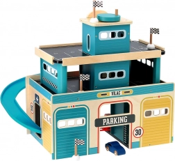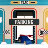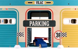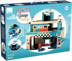 Lesena garaža v vintage slogu iz serije Vilacity ponuja otrokom neskončne možnosti igre. Zahvaljujoč drsnim vratom, dvigalu za avtomobilčke in spiralni stezi lahko otroci: