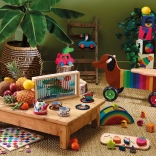 Leseni poganjalček Pisan Pesek prinaša radosten in barven dizajn, ki ga bo vaš otrok oboževal. Izdelan iz kakovostnega lesa, ta poganjalček ponuja izjemno stabilnost in varnost zaradi tihih koles, sistema proti prevračanju, in omejenega kota zasuka volana, kar minimizira tveganje za poškodbe.