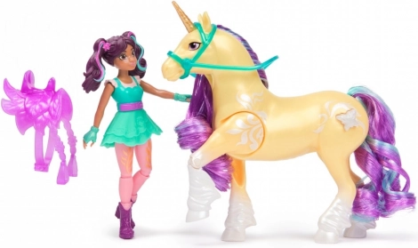 Raziščite svet domišljije s tem kompletom, ki vključuje 11 cm visoko punčko Sofijo z realističnimi podrobnostmi in gibljivimi sklepi. Samorog Zvezda je visok 12 cm in je okrašen z magičnimi podrobnostmi, vključno s prozornimi pripetimi sedli.