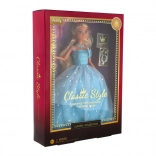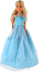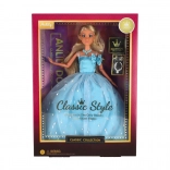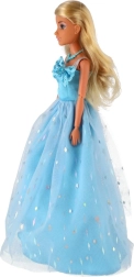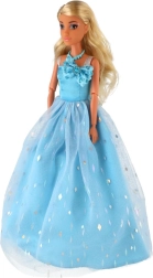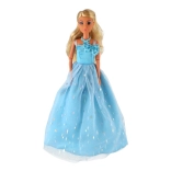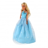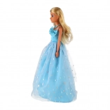 Dolga svetlomodra toaleta z nežnim leskom in cvetličnimi okraski spremeni punčko v kraljico vsake domišljijske slovesnosti.