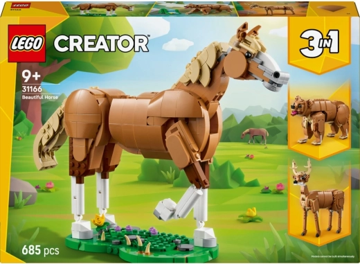 Odkrijte neomejene možnosti sestavljanja s setom Creator 3 v 1: čudovit konj. Iz enega nabora kock sestavite premično figuro konja s stojalom, ki jo lahko nastavite v tri različne položaje: na treh ali štirih nogah ali veličastno na zadnjih. Vsi modeli izstopajo po podrobni izdelavi in so odlični tako za igro kot za razstavljanje v otroški sobi.