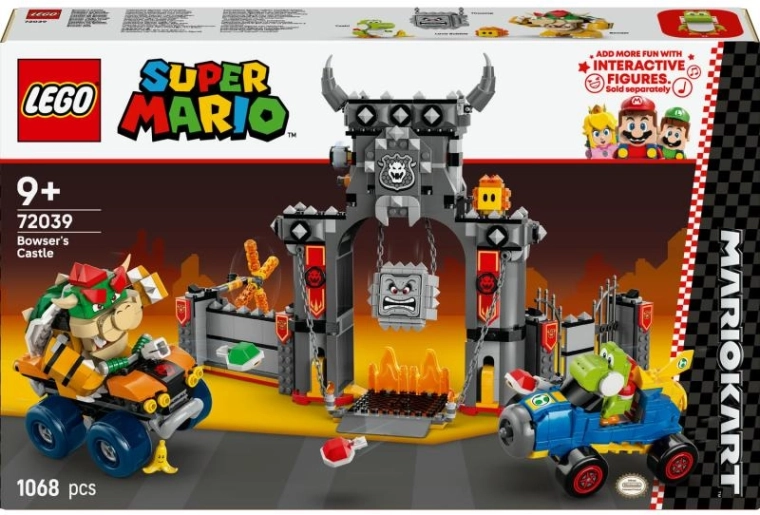 Vstopi v svet dirk in dvobojev v legendarnem Bowserjevem gradu. Ta velik set s 1068 kosi prinaša bogate igralne elemente: sestavljive grajske stene, vrteči se Fire Bar, padajočega Thwompa na verigi in interaktivne ovire z lavo. Vključene so štiri zbirateljske figurice – Bowser, Yoshi, Thwomp in Lava Bubble – ter izstrelki školjk in banana za napete dvoboje na progi.