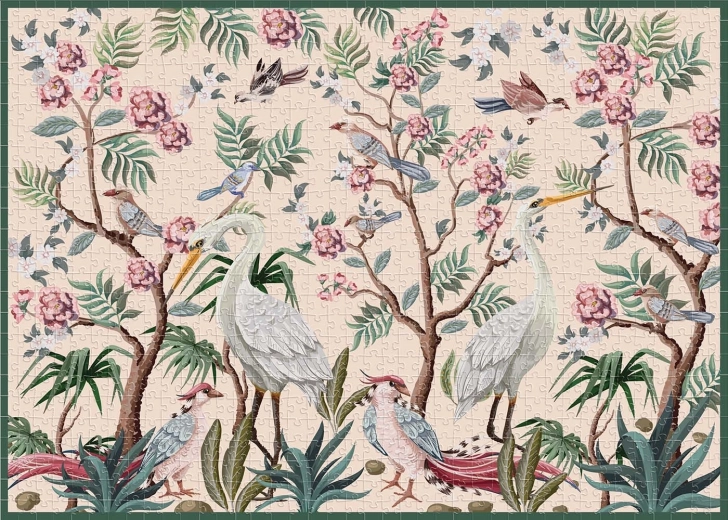 Odkrijte lepoto skrivnostnega vrta z našo sestavljanko s 1000 koščki, kjer ptice prepletajo svoja krila med cvetočimi drevesi. Popolno za ljubitelje narave in zbiratelje sestavljank.