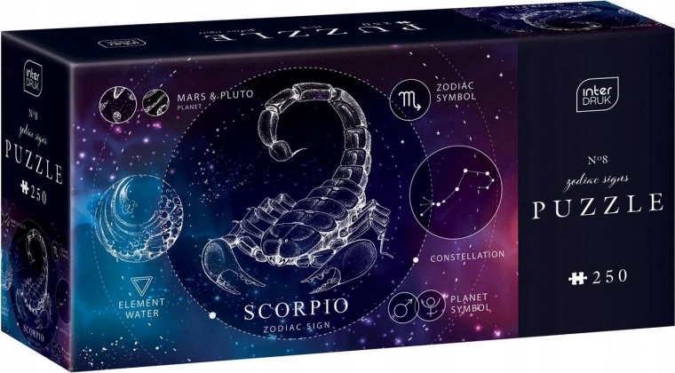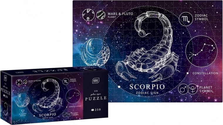 Odkrijte lepoto in skrivnost znamenja zodiaka Škorpijon z našo sestavljanko s 250 kosi. Ta sestavljanka je idealna za ljubitelje astrologije in zahtevnejše sestavljavce.