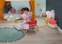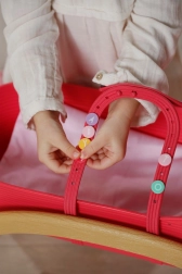 Barvite gumbe lahko preprosto pripnete na ročaje in rob košare. Otroci lahko posteljico znova in znova personalizirajo ter razvijajo domišljijo.