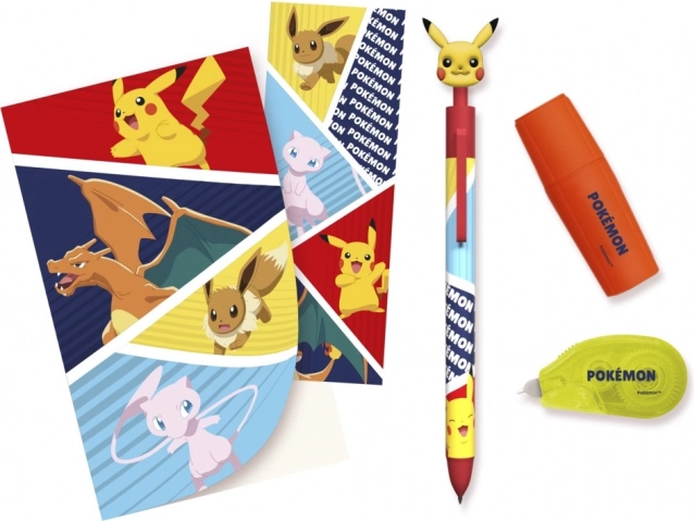 Uradno licenciran Pokémon šolski komplet: pero, korektor, označevalnik, zvezek in kazalo za oboževalce.