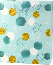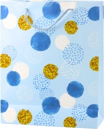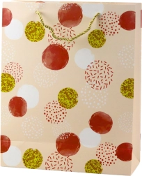 Pike različnih velikosti, nekatere s sijočim učinkom ali dekorativnim tiskom, celoti dodajo izviren in izrazit značaj. Vrečka je izdelana iz trpežnega laminiranega papirja, odpornega na prepogibe, kar omogoča varno zavijanje tudi težjih daril.