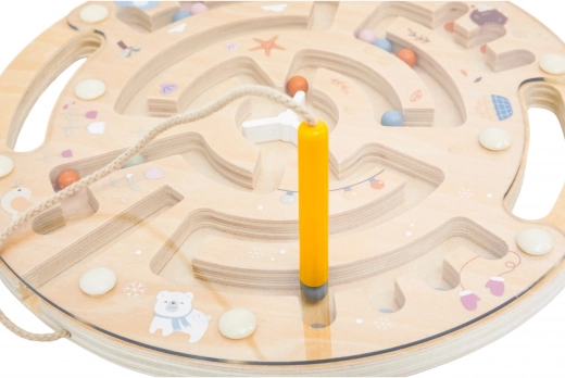 Magnetni labirint znamke VIGA je izdelan iz kakovostnega lesa in okrašen s prikupnimi ilustracijami štirih letnih časov. Ne ponuja le veliko zabave, temveč tudi podpira razvoj ročnih spretnosti in logičnega razmišljanja. S pomočjo magnetnega peresa lahko otrok premika barvne kroglice po labirintu ter vadi koordinacijo oko-roka.