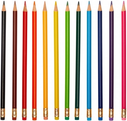Astra trikotne barvice 12 kos v živahnih barvah z radirko in šilčkom, idealne za šolsko in umetniško risanje.