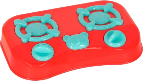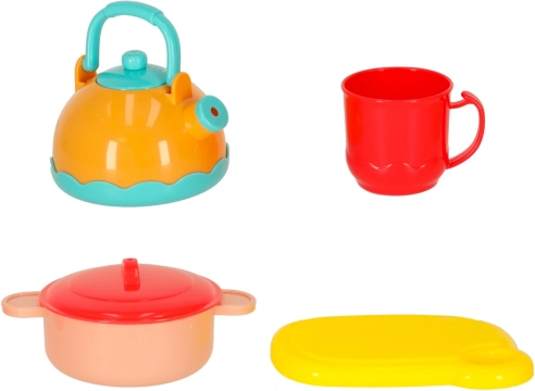 - Kuhinjski dodatki (15 kosov): čajnik, lonec s pokrovko, pribor (velik in mali nož, žlička, vilica), skodelica, deska za rezanje, otroška kuhalna plošča/kuhinjica, košarica.